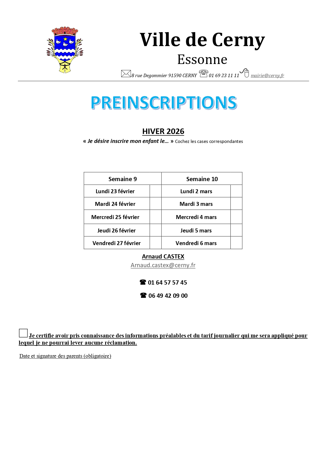 Pour plus d'informations vous pouvez contacter la mairie au 01 69 23 11 11 ou mairie@cerny.fr