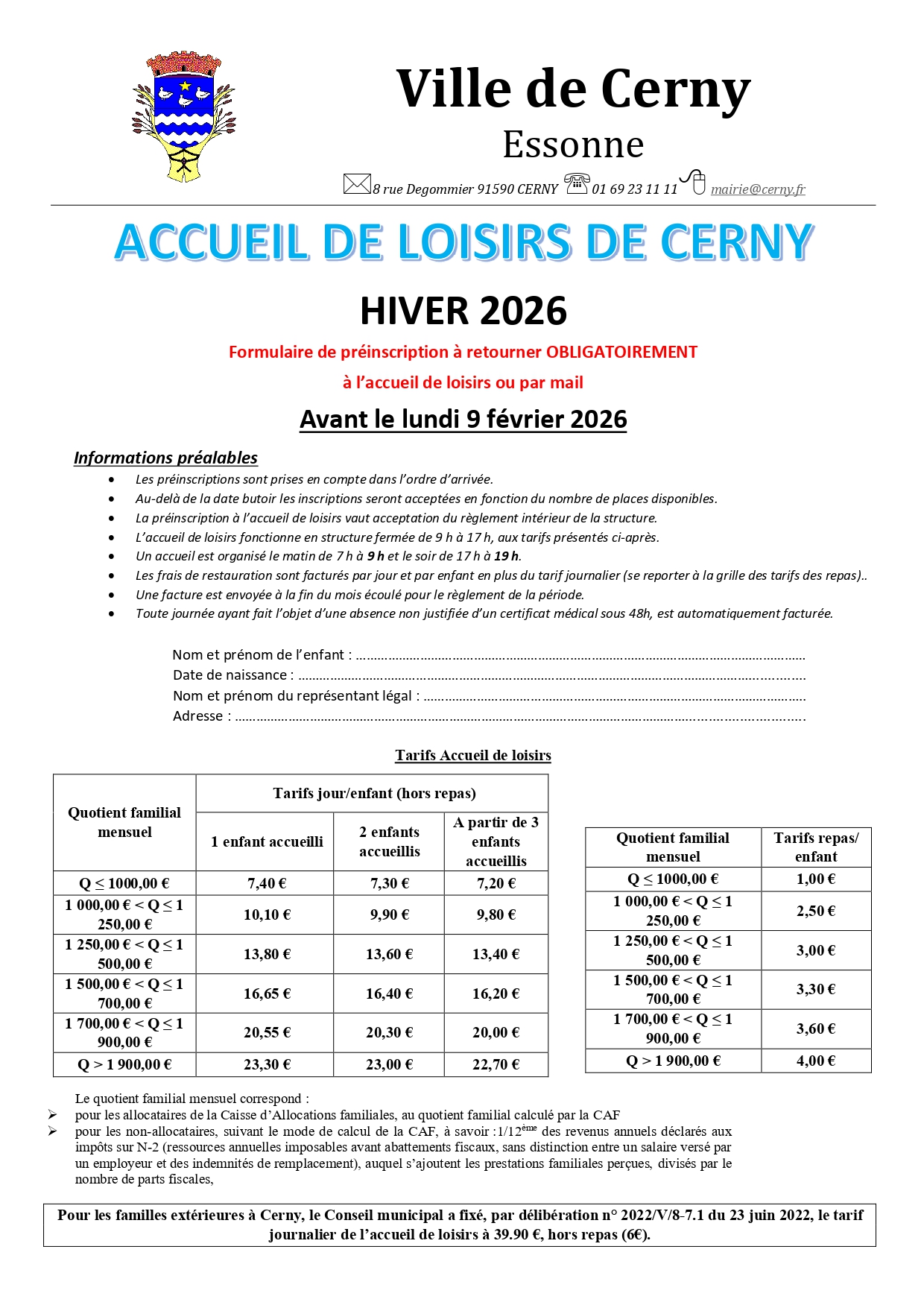 Les tarifs journaliers de l’accueil de loisirs sont fixés en fonction du quotient familial uniquement pour les familles cernoises. Ils peuvent être révisés chaque année par le Conseil Municipal.