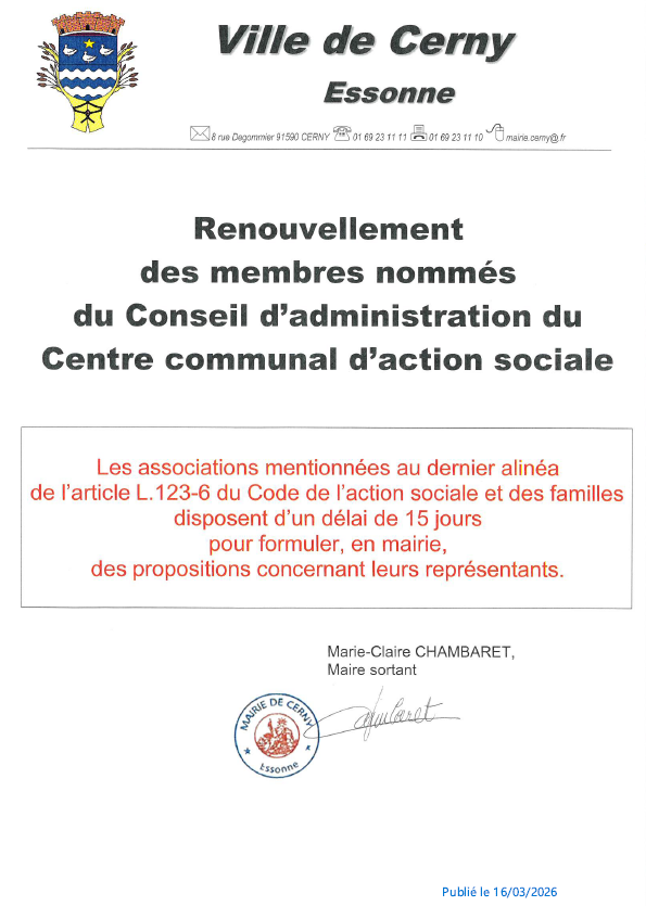 Le Centre Communal d’Action Sociale (CCAS) de Cerny est un établissement public en charge de l’aide sociale qui permet de répondre aux besoins des personnes qui rencontrent des difficultés quel que soit l’âge. Il met également des services d'aides à disposition.